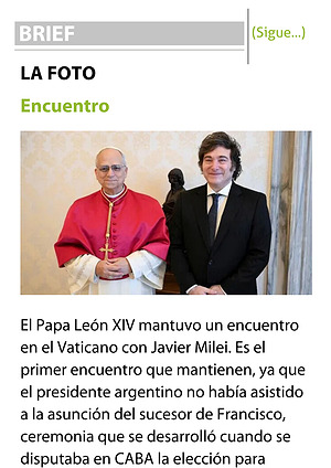 El Papa León XIV mantuvo un encuentro en el Vaticano con Javier Milei. Es el primer encuentro que mantienen, ya que el presidente argentino no había asistido a la asunción del sucesor de Francisco, ceremonia que se desarrolló cuando se disputaba en CABA la elección para legisladores locales en la que se impuso Manuel Adorni.