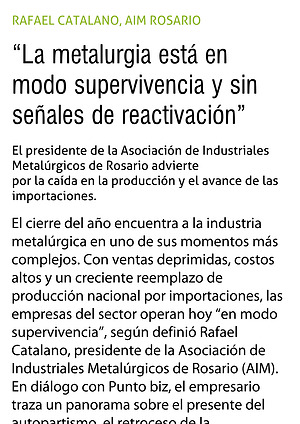 El cierre del año encuentra a la industria metalúrgica en uno de sus momentos más complejos. Con ventas deprimidas, costos altos y un creciente reemplazo de producción nacional por importaciones, las empresas del sector operan hoy “en modo supervivencia”, según definió Rafael Catalano, presidente de la Asociación de Industriales Metalúrgicos de Rosario (AIM).