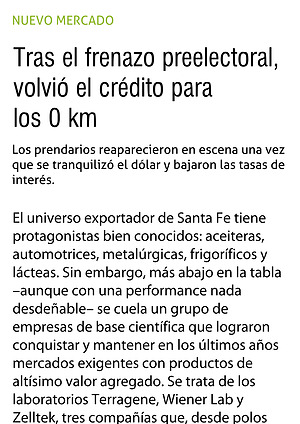 El universo exportador de Santa Fe tiene protagonistas bien conocidos: aceiteras, automotrices, metalúrgicas, frigoríficos y lácteas. Sin embargo, más abajo en la tabla –aunque con una performance nada desdeñable– se cuela un grupo de empresas de base científica que lograron conquistar y mantener en los últimos años mercados exigentes con productos de altísimo valor agregado. Se trata de los laboratorios Terragene, Wiener Lab y Zelltek, tres compañías que, desde polos tecnológicos de Rosario, Alvear y el Gran Santa Fe, representan la cara más sofisticada del entramado industrial provincial.