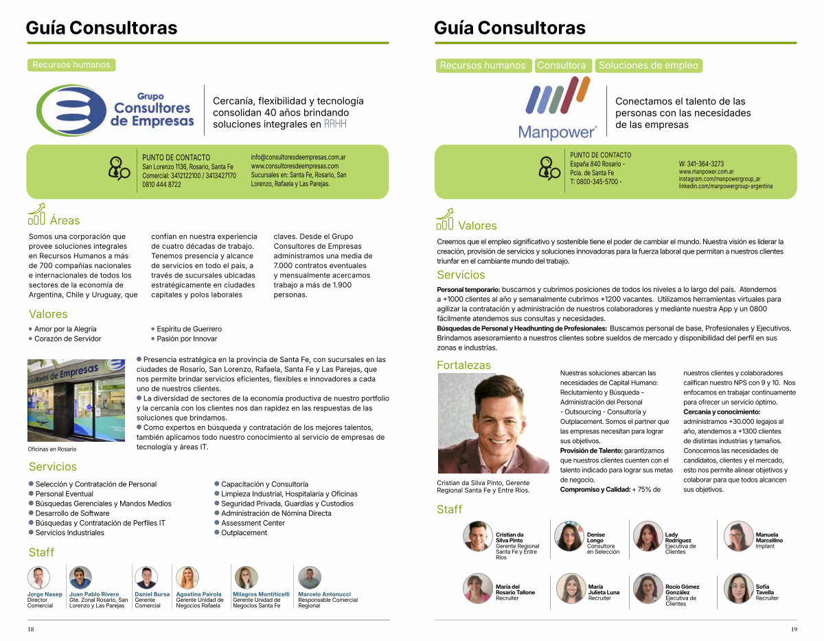 Oficinas en Rosario n Presencia estratégica en la provincia de Santa Fe, con sucursales en las ciudades de Rosario, San Lorenzo, Rafaela, Santa Fe y Las Parejas, que nos permite brindar servicios eficientes, flexibles e innovadores a cada uno de nuestros clientes. n La diversidad de sectores de la economía productiva de nuestro portfolio y la cercanía con los clientes nos dan rapidez en las respuestas de las soluciones que brindamos. n Como expertos en búsqueda y contratación de los mejores talentos, también aplicamos todo nuestro conocimiento al servicio de empresas de tecnología y áreas IT.