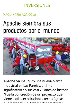 Apache SA inauguró una nueva planta industrial en Las Parejas, un hito significativo en sus casi 70 años de historia. “Fue la concreción de un proyecto que viene a ofrecer soluciones tecnológicas que potencien el trabajo del productor agropecuario y contribuyan al desarrollo del país”, destacó Carlos Castellani, presidente de la firma.. La planta cuenta con una superficie cubierta de más de 3.600 m² y demandó una inversión de u$s3,5 M.