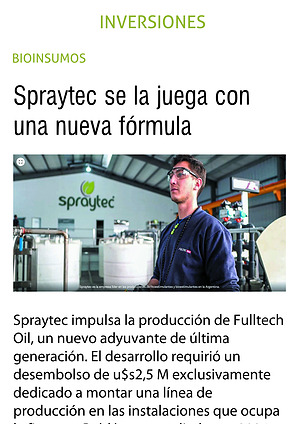 Spraytec impulsa la producción de Fulltech Oil, un nuevo adyuvante de última generación. El desarrollo requirió un desembolso de u$s2,5 M exclusivamente dedicado a montar una línea de producción en las instalaciones que ocupa la firma en Roldán, ya ampliadas en 2024. Tras el lanzamiento del nuevo producto proyectan fabricar 400.000 litros este año y cuadriplicar ese volumen en 2026.