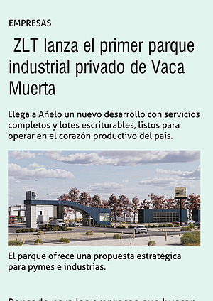 Pensado para las empresas que buscan integrarse a la cadena de valor y operar en el corazón productivo del país, ZLT lanza el Parque Industrial Vaca Muerta, un nuevo desarrollo ubicado estratégicamente sobre el kilómetro 5 de la ruta 17, en Añelo, Neuquén.