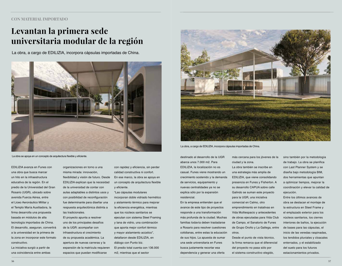 EDILIZIA avanza en Funes con una obra que busca marcar un hito en la infraestructura educativa de la región. En el predio de la Universidad del Gran Rosario( UGR), ubicado sobre avenida Fuerza Aérea, entre el Liceo Aeronáutico Militar y el Templo María Auxiliadora, la firma desarrolla una propuesta basada en módulos de alta tecnología importados de China. El desarrollo, aseguran, convertirá a la universidad en la primera de la zona en incorporar este formato constructivo. La iniciativa surgió a partir de una coincidencia entre ambas organizaciones en torno a una misma mirada: innovación, flexibilidad y visión de futuro. Desde EDILIZIA explican que la necesidad de la universidad de contar con aulas adaptables a distintos usos y con posibilidad de reconfiguración fue determinante para diseñar una respuesta arquitectónica distinta a las tradicionales. El proyecto apunta a resolver uno de los principales desafíos de la UGR: acompañar con infraestructura el crecimiento de su propuesta académica. La apertura de nuevas carreras y la expansión de la matrícula requieren espacios que puedan modificarse con rapidez y eficiencia, sin perder calidad constructiva ni confort. En ese marco, la obra se apoya en un concepto de arquitectura flexible y eficiente.“ Las cápsulas modulares incorporan doble vidriado hermético y aislamiento térmico para mejorar la eficiencia energética, mientras que los núcleos sanitarios se ejecutan con sistema Steel Framing y lana de vidrio, una combinación que aporta mejor confort térmico y mayor aislamiento acústico”, detallaron desde EDILIZIA, en diálogo con Punto biz. El predio total cuenta con 136.000 m2, mientras que el sector