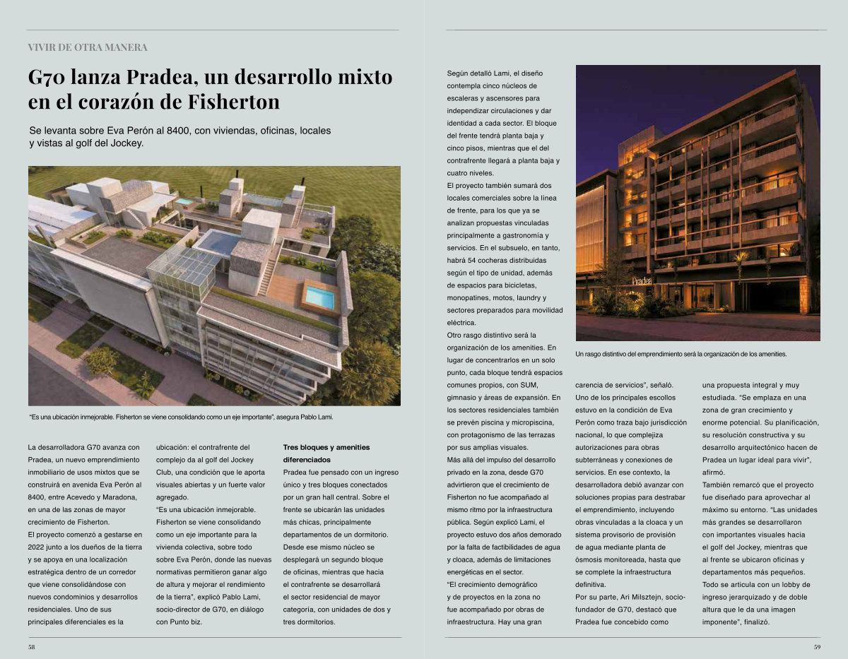 carencia de servicios”, señaló. una propuesta integral y muy Uno de los principales escollos estudiada.“ Se emplaza en una estuvo en la condición de Eva zona de gran crecimiento y Perón como traza bajo jurisdicción enorme potencial. Su planificación, nacional, lo que complejiza su resolución constructiva y su autorizaciones para obras desarrollo arquitectónico hacen de subterráneas y conexiones de Pradea un lugar ideal para vivir”, servicios. En ese contexto, la afirmó. desarrolladora debió avanzar con También remarcó que el proyecto soluciones propias para destrabar fue diseñado para aprovechar al el emprendimiento, incluyendo máximo su entorno.“ Las unidades obras vinculadas a la cloaca y un más grandes se desarrollaron sistema provisorio de provisión con importantes visuales hacia de agua mediante planta de el golf del Jockey, mientras que ósmosis monitoreada, hasta que al frente se ubicaron oficinas y se complete la infraestructura departamentos más pequeños. definitiva.