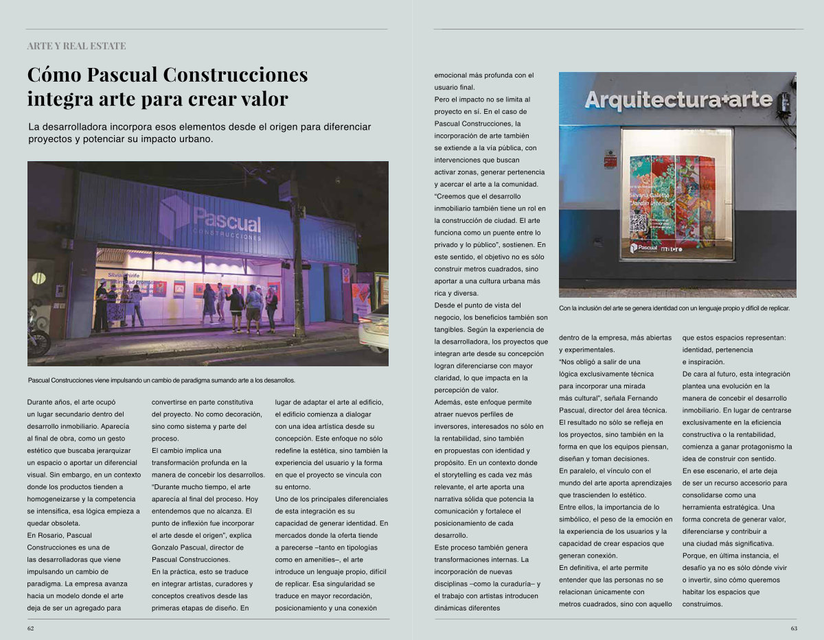 Durante años, el arte ocupó un lugar secundario dentro del desarrollo inmobiliario. Aparecía al final de obra, como un gesto estético que buscaba jerarquizar un espacio o aportar un diferencial visual. Sin embargo, en un contexto donde los productos tienden a homogeneizarse y la competencia se intensifica, esa lógica empieza a quedar obsoleta. En Rosario, Pascual Construcciones es una de las desarrolladoras que viene impulsando un cambio de paradigma. La empresa avanza hacia un modelo donde el arte deja de ser un agregado para convertirse en parte constitutiva del proyecto. No como decoración, sino como sistema y parte del proceso. El cambio implica una transformación profunda en la manera de concebir los desarrollos.“ Durante mucho tiempo, el arte aparecía al final del proceso. Hoy entendemos que no alcanza. El punto de inflexión fue incorporar el arte desde el origen”, explica Gonzalo Pascual, director de Pascual Construcciones. En la práctica, esto se traduce en integrar artistas, curadores y conceptos creativos desde las primeras etapas de diseño. En lugar de adaptar el arte al edificio, el edificio comienza a dialogar con una idea artística desde su concepción. Este enfoque no sólo redefine la estética, sino también la experiencia del usuario y la forma en que el proyecto se vincula con su entorno. Uno de los principales diferenciales de esta integración es su capacidad de generar identidad. En mercados donde la oferta tiende a parecerse – tanto en tipologías como en amenities –, el arte introduce un lenguaje propio, difícil de replicar. Esa singularidad se traduce en mayor recordación, posicionamiento y una conexión
