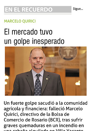Un fuerte golpe sacudió a la comunidad agrícola y financiera: falleció Marcelo Quirici, directivo de la Bolsa de Comercio de Rosario (BCR), tras sufrir graves quemaduras en un incendio en una cabaña alquilada en Villa Yacanto, Córdoba. Tenía 60 años y era secretario de la BCR, del Mercado Argentino de Valores (MAV) y tesorero del Centro de Corredores de Cereales de Rosario.